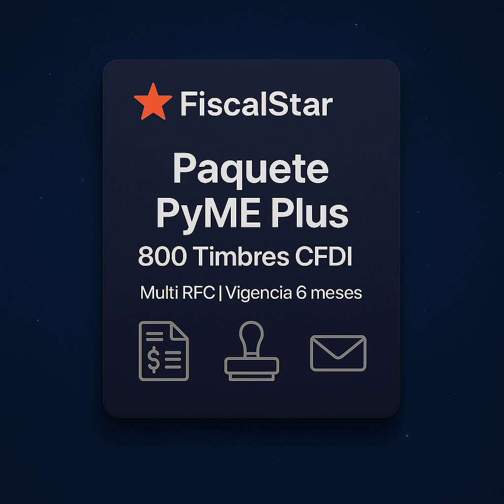 El Paquete PyME Plus de FiscalStar está diseñado para empresas que requieren un mayor volumen de timbrado sin perder control ni soporte. Con 800 timbres CFDI multi RFC, podrás emitir tus facturas con total seguridad, cumpliendo con los lineamientos del SAT y disfrutando de atención personalizada.
